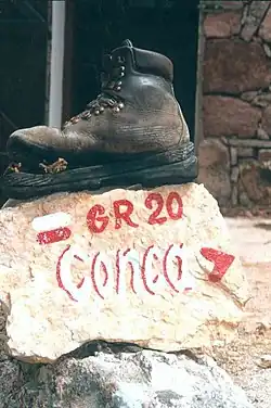 Le GR 20 est souvent qualifié de «chemin le plus difficile d’Europe». Long de 179 km[15],[16] et cumulant un dénivelé positif d'environ 11 000 mètres[17], il consiste en un parcours de montagne exigeant, surtout en cas d'intempéries (orages, brouillard, neige, mais également la pluie qui peut rendre glissantes les plaques rocheuses).