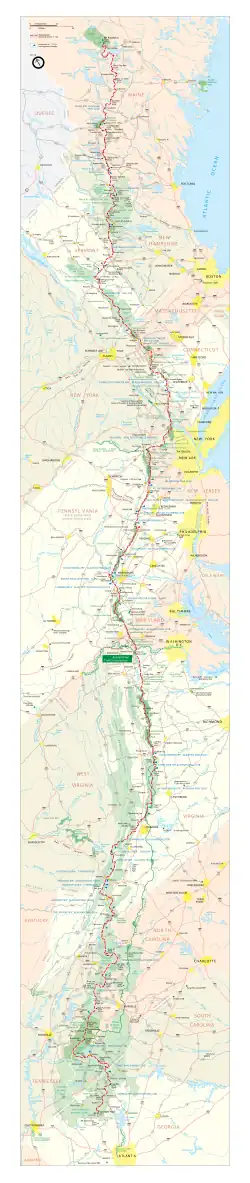 Long d'environ 3 510 kilomètres[Note 1] il relie le mont Springer, dans la forêt nationale de Chattahoochee-Oconee, en Géorgie, au mont Katahdin dans le parc d’État Baxter, dans le Maine[1]. Ce faisant, il traverse, en plus de ces États, la Caroline du Nord, le Tennessee, la Virginie, la Virginie-Occidentale, le Maryland, la Pennsylvanie, le New Jersey, l'État de New York, le Connecticut, le Massachusetts, le Vermont et le New Hampshire. Il se prolonge au Canada par le sentier international des Appalaches, long de plus de 3 100 km, qui part du mont Katahdin pour rejoindre Belle Isle au nord de Terre-Neuve, dans l'océan Atlantique.