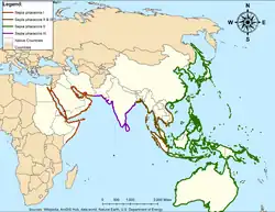 Elle se rencontre dans l'océan Indien, la mer Rouge, le golfe Persique. Elle se trouve aussi en Asie et en Océanie, dans l'océan indien et la mer d'Andaman...