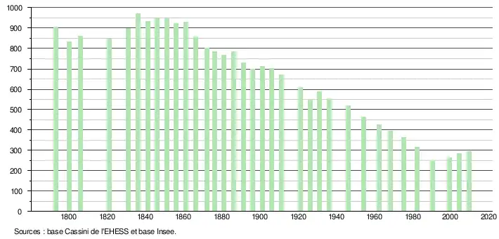 - ↑ Dans le tableau des recensements et le graphique, par convention dans Wikipédia, le principe a été retenu, pour les populations légales postérieures à 1999 de n’afficher dans le tableau des recensements et le graphique que les populations correspondant à l'année 2006, première population légale publiée calculée conformément aux concepts définis dans le décret no 2003-485 du 5 juin 2003, et les années correspondant à une enquête exhaustive de recensement pour les communes de moins de 10 000 habitants, ainsi que la dernière population légale publiée par l’Insee.