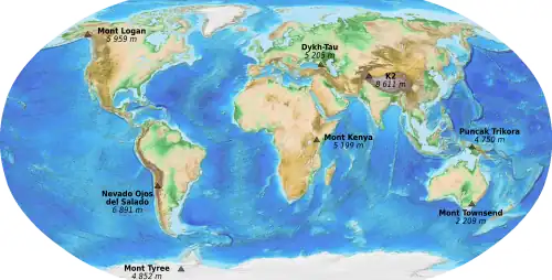 Les ascensions du mont Kenya, du Dykh-Tau et du mont Tyree sont des ascensions relativement plus techniques que celles respectivement du Kilimandjaro, de l'Elbrouz et du mont Vinson, qui ne relèvent que de la marche en altitude. Le mont Tyree en particulier n'a été gravi qu'à cinq reprises, et par dix personnes au total, toutes alpinistes de haut niveau, entre la première ascension en 1967 et 2012.
