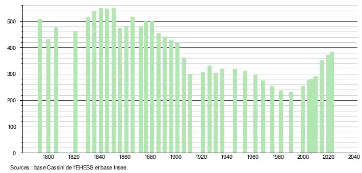L'évolution du nombre d'habitants est connue à travers les recensements de la population effectués dans la commune depuis 1793. Pour les communes de moins de 10 000 habitants, une enquête de recensement portant sur toute la population est réalisée tous les cinq ans, les populations de référence des années intermédiaires étant quant à elles estimées par interpolation ou extrapolation[23]. Pour la commune, le premier recensement exhaustif entrant dans le cadre du nouveau dispositif a été réalisé en 2004[24].