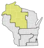 Le 7e district congressionnel du Wisconsin est un district situé dans le nord-ouest et le centre du Wisconsin ; c'est géographiquement le plus grand district de l'État, couvrant 20 comtés (en tout ou en partie), pour un total de 18 787 milles carrés. Le district comprend les comtés suivants : Ashland, Barron, Bayfield, Burnett, St. Croix, Chippewa (partiel), Clark, Douglas, Florence, Forest, Iron, Jackson (partiel), Juneau (partiel), Langlade, Lincoln, Marathon, Monroe (partiel), Oneida, Polk, Price, Rusk, Sawyer, Taylor, Vilas, Washburn et Wood (partiel).