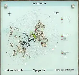 Sergilla s'étale dans un vallon dont le fond est occupé par la partie la plus ancienne, datée du Ier siècle de notre ère. Il n'en subsiste que des ruines d'où émergent des montants de portes surmontés parfois de linteaux. Il s'agissait de modestes maisons très imbriquées, construites avec des pierres non taillées.