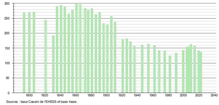 L'évolution du nombre d'habitants est connue à travers les recensements de la population effectués dans la commune depuis 1793. Pour les communes de moins de 10 000 habitants, une enquête de recensement portant sur toute la population est réalisée tous les cinq ans, les populations de référence des années intermédiaires étant quant à elles estimées par interpolation ou extrapolation[26]. Pour la commune, le premier recensement exhaustif entrant dans le cadre du nouveau dispositif a été réalisé en 2004[27].