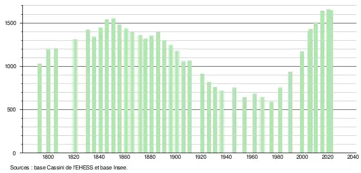 L'évolution du nombre d'habitants est connue à travers les recensements de la population effectués dans la commune depuis 1793. Pour les communes de moins de 10 000 habitants, une enquête de recensement portant sur toute la population est réalisée tous les cinq ans, les populations de référence des années intermédiaires étant quant à elles estimées par interpolation ou extrapolation[14]. Pour la commune, le premier recensement exhaustif entrant dans le cadre du nouveau dispositif a été réalisé en 2005[15].