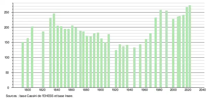 L'évolution du nombre d'habitants est connue à travers les recensements de la population effectués dans la commune depuis 1793. Pour les communes de moins de 10 000 habitants, une enquête de recensement portant sur toute la population est réalisée tous les cinq ans, les populations de référence des années intermédiaires étant quant à elles estimées par interpolation ou extrapolation[23]. Pour la commune, le premier recensement exhaustif entrant dans le cadre du nouveau dispositif a été réalisé en 2008[24].