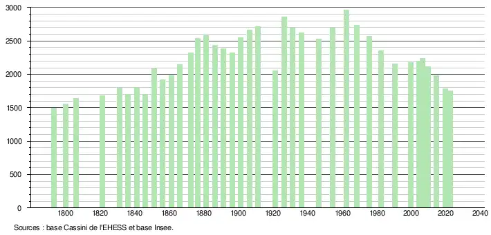 L'évolution du nombre d'habitants est connue à travers les recensements de la population effectués dans la commune depuis 1793. Pour les communes de moins de 10 000 habitants, une enquête de recensement portant sur toute la population est réalisée tous les cinq ans, les populations de référence des années intermédiaires étant quant à elles estimées par interpolation ou extrapolation[39]. Pour la commune, le premier recensement exhaustif entrant dans le cadre du nouveau dispositif a été réalisé en 2004[40].