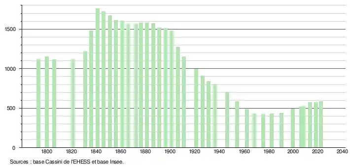 L'évolution du nombre d'habitants est connue à travers les recensements de la population effectués dans la commune depuis 1793. Pour les communes de moins de 10 000 habitants, une enquête de recensement portant sur toute la population est réalisée tous les cinq ans, les populations de référence des années intermédiaires étant quant à elles estimées par interpolation ou extrapolation[22]. Pour la commune, le premier recensement exhaustif entrant dans le cadre du nouveau dispositif a été réalisé en 2008[23].