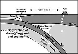La serpentinisation est un phénomène majeur dans les zones de subduction agissant fortement sur le cycle de l'eau et la géodynamique d'une zone de subduction[40]. La roche du manteau y est refroidie par la dalle de subduction à des températures auxquelles la serpentinite est stable, et les fluides sont libérés de la dalle de subduction en grandes quantités dans la roche du manteau ultramafique[40]. La preuve directe que la serpentinisation a lieu dans l'arc insulaire des îles Mariannes est fournie par l'activité des volcans de boue de serpentinite. Des xénolithes de harzburgite et moins fréquemment de dunite sont parfois projetés dans les éruptions des volcans de boue, apportant des informations sur la nature du protolithe[41].