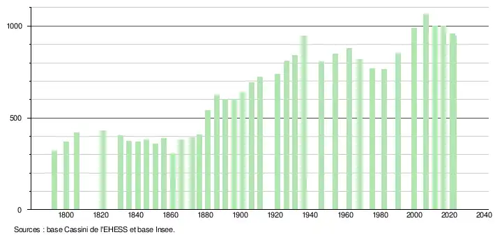 L'évolution du nombre d'habitants est connue à travers les recensements de la population effectués dans la commune depuis 1793. Pour les communes de moins de 10 000 habitants, une enquête de recensement portant sur toute la population est réalisée tous les cinq ans, les populations de référence des années intermédiaires étant quant à elles estimées par interpolation ou extrapolation[41]. Pour la commune, le premier recensement exhaustif entrant dans le cadre du nouveau dispositif a été réalisé en 2006[42].