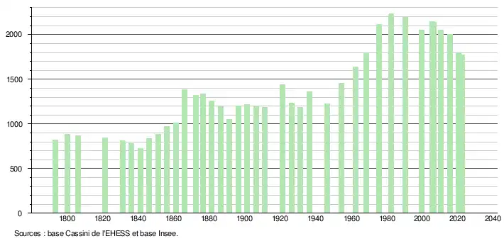 L'évolution du nombre d'habitants est connue à travers les recensements de la population effectués dans la commune depuis 1793. Pour les communes de moins de 10 000 habitants, une enquête de recensement portant sur toute la population est réalisée tous les cinq ans, les populations de référence des années intermédiaires étant quant à elles estimées par interpolation ou extrapolation[25]. Pour la commune, le premier recensement exhaustif entrant dans le cadre du nouveau dispositif a été réalisé en 2005[26].