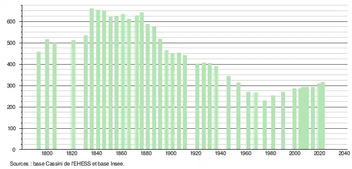 L'évolution du nombre d'habitants est connue à travers les recensements de la population effectués dans la commune depuis 1793. Pour les communes de moins de 10 000 habitants, une enquête de recensement portant sur toute la population est réalisée tous les cinq ans, les populations de référence des années intermédiaires étant quant à elles estimées par interpolation ou extrapolation[18]. Pour la commune, le premier recensement exhaustif entrant dans le cadre du nouveau dispositif a été réalisé en 2004[19].