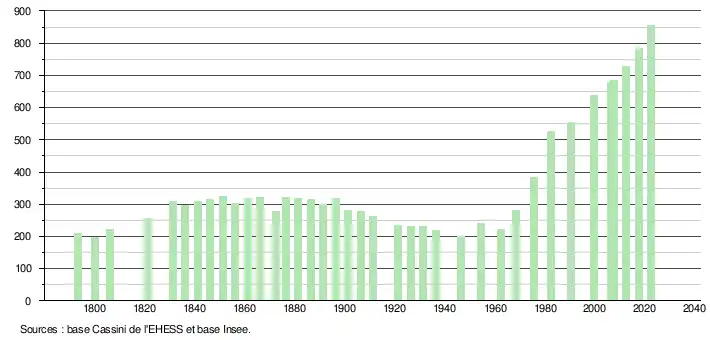 L'évolution du nombre d'habitants est connue à travers les recensements de la population effectués dans la commune depuis 1793. Pour les communes de moins de 10 000 habitants, une enquête de recensement portant sur toute la population est réalisée tous les cinq ans, les populations de référence des années intermédiaires étant quant à elles estimées par interpolation ou extrapolation[38]. Pour la commune, le premier recensement exhaustif entrant dans le cadre du nouveau dispositif a été réalisé en 2007[39].