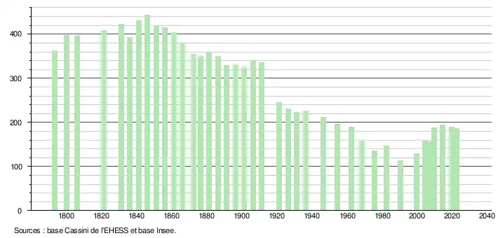 L'évolution du nombre d'habitants est connue à travers les recensements de la population effectués dans la commune depuis 1793. Pour les communes de moins de 10 000 habitants, une enquête de recensement portant sur toute la population est réalisée tous les cinq ans, les populations de référence des années intermédiaires étant quant à elles estimées par interpolation ou extrapolation[14]. Pour la commune, le premier recensement exhaustif entrant dans le cadre du nouveau dispositif a été réalisé en 2004[15].