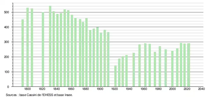 L'évolution du nombre d'habitants est connue à travers les recensements de la population effectués dans la commune depuis 1793. Pour les communes de moins de 10 000 habitants, une enquête de recensement portant sur toute la population est réalisée tous les cinq ans, les populations de référence des années intermédiaires étant quant à elles estimées par interpolation ou extrapolation[32]. Pour la commune, le premier recensement exhaustif entrant dans le cadre du nouveau dispositif a été réalisé en 2006[33].