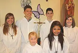 Un groupe de servants d'autel mixte.