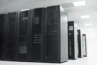 Rangées de baies contenant des serveurs web dans une salle dédiée en 2017.