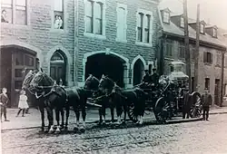 Pompe à incendie quittant la caserne de pompiers Youville, vers 1900[15].