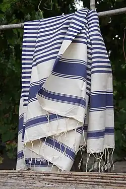 - Dans le même type de lieux, on peut également utiliser une serviette de bain comme pièce de vêtement rudimentaire, enroulée autour de la taille (comme un kilt), ou en dessous des épaules (pour masquer également la poitrine), à l'instar d'un peignoir. Il s'agit ici d'assurer le respect de la pudeur.