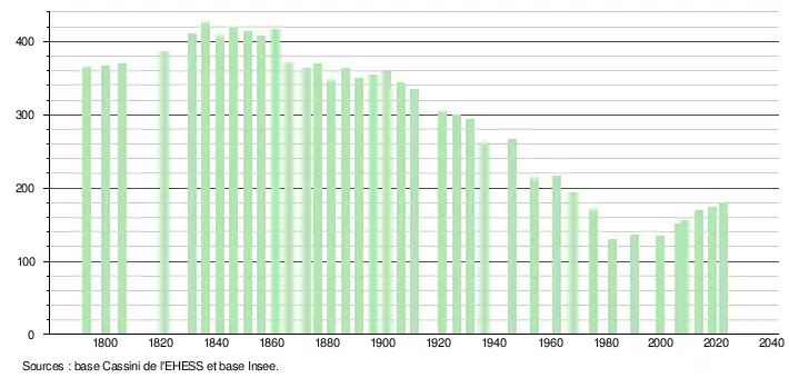 L'évolution du nombre d'habitants est connue à travers les recensements de la population effectués dans la commune depuis 1793. Pour les communes de moins de 10 000 habitants, une enquête de recensement portant sur toute la population est réalisée tous les cinq ans, les populations de référence des années intermédiaires étant quant à elles estimées par interpolation ou extrapolation[14]. Pour la commune, le premier recensement exhaustif entrant dans le cadre du nouveau dispositif a été réalisé en 2008[15].
