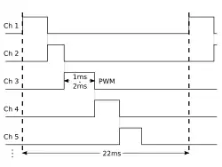 Les servomoteurs sont commandés par l'intermédiaire d'un câble électrique à trois fils qui permet d’alimenter le moteur et de lui transmettre des consignes de position sous forme d’un signal codé en largeur d'impulsion plus communément appelé PWM. Cela signifie que c'est la durée des impulsions qui détermine l'angle absolu de l'axe de sortie et donc la position du bras de commande du servomoteur. Le signal est répété périodiquement, en général toutes les 20 millisecondes, ce qui permet à l'électronique de contrôler et de corriger continuellement la position angulaire de l'axe de sortie, cette dernière étant mesurée par le potentiomètre.