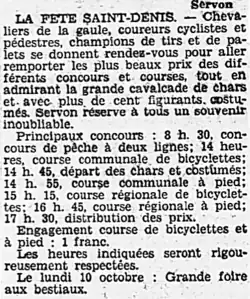 - ↑ « Servon. La fête Saint-Denis », L'Ouest-Éclair, , p. 4 (lire en ligne, consulté le ).