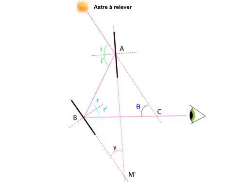Le sextant permet de mesurer des angles jusqu'à 120° bien que le limbe ne fasse qu'un sixième de cercle (ce qui lui vaut son nom). C'est grâce à la double réflexion du jeu de miroir qu'est réalisée cette action. Le milieu entourant le sextant sera supposé transparent, homogène et isotrope (c'est-à-dire partout le même sans dévier les rayons lumineux). En appliquant les lois de Snell-Descartes, les indices de réfractions étant les mêmes (l'air est identique autour du sextant), l'angle incident et l'angle réfléchi sont donc égaux.