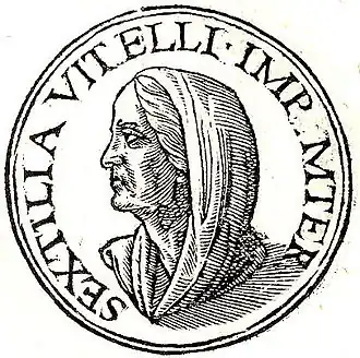 Sextilia le rappelle alors à ses racines italiennes, lui qui entre à Rome en conquérant suivi par des troupes en grande partie germaniques, pour l'inciter à épargner le peuple romain[7]. En effet, ses troupes ont surnommé Aulus Vitellius « Germanicus ». Les protestations de Sextilia contre ce surnom, qui souligne plus son attachement aux soldats recrutés en Germanie-Inférieure que ses exploits militaires, sont documentées par Tacite au livre II de ses Histoires par les mots suivants : « Celle-ci, dit-on, à la première lettre de son fils, protesta que c'était de Vitellius et non de Germanicus qu'elle était mère »[8].