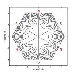 Un sextupôle magnétique (également connu sous le nom d'aimant sextupolaire ou d'aimant hexapolaire) se compose de six pôles magnétiques disposés en alternant les pôles nord et les pôles sud autour d'un axe[1]. Ils sont utilisés dans les accélérateurs de particules[1] pour le contrôle des aberrations chromatiques et pour l'amortissement de l'instabilité tête-queue (en anglais : head tail instability). Deux ensembles d'aimants sextupolaires sont utilisés dans les microscopes électroniques en transmission pour corriger l'aberration sphérique.