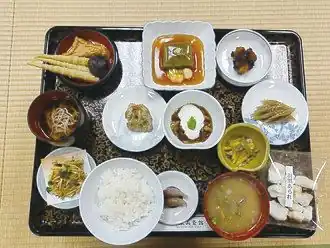 • l'abstention de produits carnés. Le bouddhisme promeut la compassion pour tous les êtres : on ne peut donc les tuer pour les manger. Au Japon, la cuisine shōjin ryōri est végétale, faisant l'impasse sur tout produit d'origine animale. Certains moines utilisent du lait ou du beurre dans certaines recettes, mais c'est très rare[6] ;
