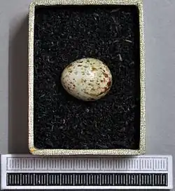 Les œufs, de 21 sur 12 mm sont vert pâle taché de brun-rouge, avec des marques gris-pourpre et lavande en second plan.