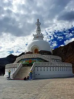 Ce stûpa bouddhiste, dont l'entrée est orientée vers l'est, comporte deux niveaux concentriques. Deux statues de Bouddha sont visibles à l'avant et à l'arrière. Tout autour, une grande place offre une vue panoramique sur la ville de Leh et la vallée de l'Indus.
