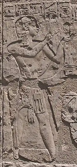 - ↑ L'expression maâ-kherou qui suit le nom du prince est la formule usuelle chez les anciens égyptiens désignant les défunts, que l'on traduit par justifié ou au bâ (à l'âme) juste de voix.