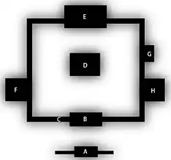 - B. Kairō (回廊・廻廊). Passage long et couvert, comme un portique, qui entoure le kondō et la pagode[16] ;