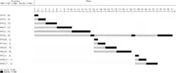 Exécution d'un ordonnancement avec temps restant court en premier. Chaque ligne représente un processus et chaque case noire représente une période d'exécution effective du processus.