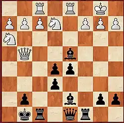 Après le sacrifice en b2, l'échec en b6 oblige le Roi blanc à aller en c1, la case a1 menant trop vite à des difficultés insolubles. La Dame b6 est idéalement placée puisqu’elle défend également le pion e6, ce qui autorise Fe8 qui chasse la Dame g6. La fourchette Cavalier e2 et pion a2 par Da6 mène au gain du pion a2. L’attaque du pion c2 par Fa4 et l’avancée du pion central obligeant les Blancs à se désolidariser de c2 aboutissent à la destruction de la position, en l’occurrence, dans le choix défensif des Blancs, au gain de la Dame par Te4. Un magnifique sacrifice spéculatif.