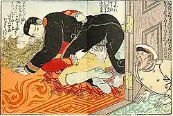 - Les enpon (艶本) ou shunpon (春本)[15] étaient des livres érotiques et le format le plus populaire de ces trois types. Ils ont été produits tout au long de la période Edo et au début de l'ère Taishō. Beaucoup d'entre eux ont été imprimés en noir et blanc, et d'autres sont passés à des versions en couleur, en utilisant la même évolution technique que celle de l'histoire de l'ukiyo-e.