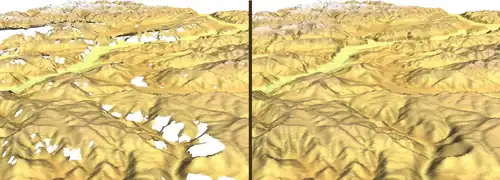 - ↑ La majorité des logiciels d'édition SIG effectuent cette opération automatiquement par interpolation avec les pixels adjacents. Si la zone vide est importante, cela peut nécessiter un traitement au cas par cas pour éviter les incohérences en s'aidant d'autres sources.