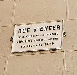 Autre souvenir du siège de 1479 est la rue d’Enfer (proche de la cave, en montant vers la Collégiale et la Place Nationale). Dans cette ruelle étroite et en pente, les bourgeois de Dole se sont retranchés et ont massacré les envahisseurs français pendant un temps avant de céder finalement devant le nombre. Une plaque de rue commémore aujourd'hui cet événement.