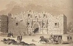 Lorsque les troupes mexicaines quittèrent San Antonio de Bexar (aujourd'hui San Antonio aux États-Unis), les soldats texans établirent une garnison à la mission Alamo, un ancien avant-poste religieux espagnol qui avait été transformé en forteresse improvisée[12]. Décrit par Santa Anna comme « une fortification irrégulière en valant à peine le nom[12] », l'Alamo avait été conçu pour repousser les attaques des tribus amérindiennes et non une armée équipée de canons[13]. Le complexe se composait d'une grande place centrale qui était bordée dans le coin sud-est par une chapelle et à l'ouest par un bâtiment à un étage appelé les casernes basses[14]. Une palissade en bois s'étendait entre ces deux bâtiments[15]. Les casernes hautes à deux étages s'étendaient au nord de la chapelle[14] et des enclos pour les chevaux et le bétail étaient situés à l'arrière[16]. Ces différents bâtiments étaient reliés par des murs qui mesuraient au moins 84 cm d'épaisseur et étaient hauts d'entre 2,7 et 3,7 m[17],[n 1].