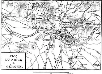 En août, les Français prirent le château de Mont Joui[2], l'élément principal de la défense. La place était investie dès le avec pour l'infanterie le général Verdier à la tête de l'infanterie de la confédération du Rhin, le général Pino et les Italiens, le général Sanson pour le génie et le général Taviel pour l'artillerie. Première tranchée le , le bombardement commençait le 14 après avoir pris de nuit le moulin neuf et le faubourg de Pedreto ; une sortie venant tant de la ville que du fort se fit le 17, mais fut repoussée par le colonel Legras à la tête de son 2e régiment westphalien. Le à 22 h, après de longs bombardements et le sacrifice des vélites italiens, les Espagnols se retirèrent vers la ville en ne laissant que ruines. Le , le général Blake revint et réussit à faire entrer 4 000 fantassins, 500 cavaliers et 1 500 mulets du général Garcia-Condé par la rive droite du Ter en faisant diversion devant Hostalric.