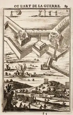 Les travaux de tranchée se poursuivent lentement mais sûrement. Le 5 juillet, la parallèle atteint la redoute de la Justice dont les créneaux sont abattus par l'artillerie. Des éclaireurs français entrent dans la place et la trouvent évacuée mais les Impériaux ont disposé plusieurs fourneaux de mine qu'ils font exploser et la détruisent[26]. Les travaux sont ralentis par les pluies mais les assiégeants finissent par encercler deux ouvrages extérieurs, le fort du Prince Alexandre et le fort Mélac. Le premier est pris d'assaut dans la nuit du 11 au 12 juillet ; les assiégés tentent une sortie et font exploser deux fourneaux au milieu du combat, tuant des hommes des deux camps, mais l'ouvrage reste aux mains des Français[27]. Les Français creusent une deuxième, puis une troisième parallèle qui leur permettent de faire avancer leurs batteries et canonner à revers, par ricochet, la lunette de Mélac et les autres ouvrages extérieurs. Les assiégés cherchent à s'y opposer par des mines et par une sortie, le 17 juillet, où les Français du régiment de Navarre perdent 11 officiers et 150 soldats tués ou blessés. Dans la nuit du 18 au 19 juillet, le feu prend à l'arsenal de la place, détruisant 15 000 mousquets et tous les affûts d'artillerie de rechange[28]. Dans la nuit du 23 au 24 juillet, les Impériaux abandonnent une autre lunette trop exposée, non sans disputer le terrain par une sortie. Dans la nuit du 31 juillet au , les Français des régiments de Navarre, Beaujolais et Périgord mènent une attaque contre les lunettes de Mélac et autres ; plusieurs mines éclatent et les fantassins se battent au milieu des cratères d'explosion. Les Français creusent une nouvelle parallèle pour isoler deux lunettes qui, coupées de la ville, doivent se rendre après la mort de la plupart de leurs hommes[29].