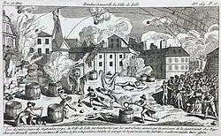 Aussitôt que ces réponses furent parvenues au général ennemi, le bombardement commença le lendemain , et le feu se manifesta aux casernes de Fives, à Saint-Étienne et dans divers quartiers de la ville. Celui de Saint-Sauveur surtout devint le foyer d'un vaste incendie. La femme du duc Albert, Marie-Christine d'Autriche, s'empressa de venir trouver son mari et d'assister joyeusement à ce spectacle déchirant. On assure qu'elle pointa elle-même plusieurs mortiers sur la ville[5].