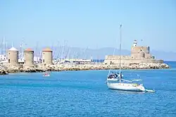 Le premier objectif des Ottomans fut la tour Saint-Nicolas, élément clé du dispositif défensif situé entre le port de Mandraki et le port principal, et dont la prise aurait permis aux Turcs d'interdire aux navires chrétiens l'accès à la ville[1]. L'artillerie turque commença par un long bombardement avant que l'infanterie ne mène deux attaques amphibies en juin (nuit du 8 au et journée du 18), qui furent repoussées par une âpre défense.