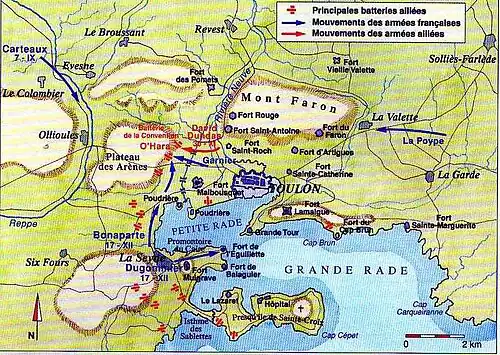 Le 31 août, Carteaux s'empare des gorges d'Ollioules, mal défendues. Le contre-amiral Gravina les reprend aussitôt mais, faute de renforts, ne peut exploiter son succès et les Anglo-Espagnols les évacuent peu après[6]. Le chef de l'artillerie de Carteaux, le lieutenant-colonel Elzéar-Auguste Cousin de Dommartin, ayant été blessé à Ollioules le , les représentants spéciaux de la Convention, Paul Barras, Fréron, Robespierre le Jeune et Antoine Christophe Saliceti, lui imposent le jeune capitaine Napoléon Bonaparte, présent à l'armée depuis Avignon, malgré l'antipathie réciproque entre les deux hommes.