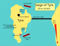 Alexandre comprend qu'il a besoin de navires pour conquérir la cité. Quelques cités alliées (dont Rhodes et Soles) ou conquises auparavant (dont Byblos, Sidon, Arados) envoient plus de 200 navires pour le soutenir. Il les utilise afin de trouver une faille et ouvrir une brèche en éperonnant les murailles. Puis, les Macédoniens, emmenés par Alexandre en personne, se focalisent sur la brèche, surmontent les murailles et tuent entre 6 000 et 8 000 soldats[5]. Du fait que les Phéniciens ont notamment tué les ambassadeurs d'Alexandre sur les murailles, les Macédoniens veulent se venger : 2 000 jeunes hommes sont crucifiés, 13 000 esclaves sont capturés, tandis que le reste de la population, soit 30 000 personnes, est réduit en esclavage[6]. Certains auteurs signalent même une éradication totale de la population[7]. Ce carnage a peut-être servi à dissuader d'autres cités de s'opposer à la conquête d'Alexandre. La destruction de la ville a quant à elle également servi à déstabiliser les marins perses puisque la flotte phénicienne représentait une véritable puissance navale pour ces derniers. Ainsi, il a coupé tout espoir d'aide aux révoltés du côté de l'Orient. La chute de Tyr marque la fin du combat séculaire qui opposait les Phéniciens et les Hellènes pour la domination du bassin oriental de la Méditerranée. Ce qui a contribué au fort retentissement du triomphe hellénique sur cet environnement sémitique. Même si Tyr fut rebâtie par la suite, elle n'a jamais pu retrouver son éclat d'antan, le pôle commercial qu'elle était ayant été remplacé lors de l'essor d'Alexandrie d'Égypte[8].