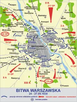 La bataille de Varsovie pendant la Seconde Guerre mondiale oppose l'Armée « Varsovie » polonaise et la population civile de Varsovie aux forces allemandes : la 3e armée et la 4e armée de la Heer et les Luftflotte 1 et Luftflotte 4 de la Luftwaffe. L'attaque allemande débute par un grand bombardement aérien dès le premier jour de la guerre, le . La capitale polonaise est bombardée comme soixante-quatre autres villes polonaises[1]. L’agresseur ne vise pas que les infrastructures stratégiques militaires, mais il s’attaque aussi aux habitations.