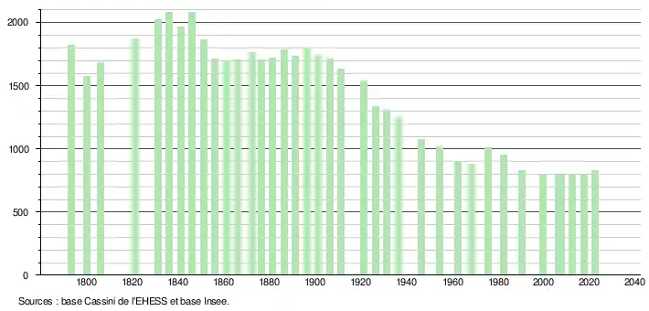 L'évolution du nombre d'habitants est connue à travers les recensements de la population effectués dans la commune depuis 1793. Pour les communes de moins de 10 000 habitants, une enquête de recensement portant sur toute la population est réalisée tous les cinq ans, les populations de référence des années intermédiaires étant quant à elles estimées par interpolation ou extrapolation[23]. Pour la commune, le premier recensement exhaustif entrant dans le cadre du nouveau dispositif a été réalisé en 2007[24].