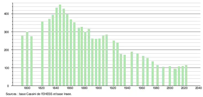 L'évolution du nombre d'habitants est connue à travers les recensements de la population effectués dans la commune depuis 1793. Pour les communes de moins de 10 000 habitants, une enquête de recensement portant sur toute la population est réalisée tous les cinq ans, les populations de référence des années intermédiaires étant quant à elles estimées par interpolation ou extrapolation[32]. Pour la commune, le premier recensement exhaustif entrant dans le cadre du nouveau dispositif a été réalisé en 2007[33].